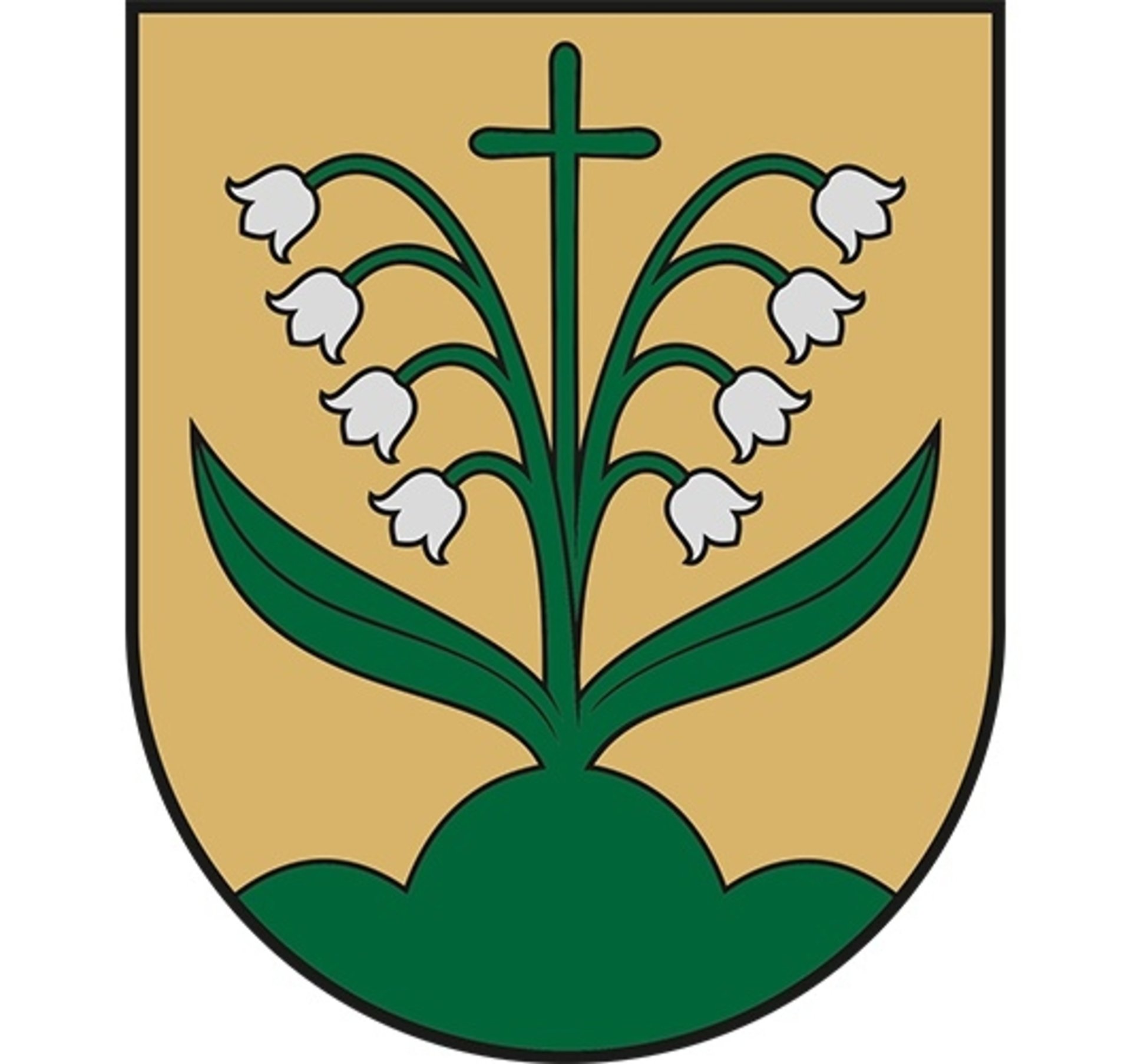 Herbo aprašymas: Auksiniame lauke ant žalio trikalnio skydo papėdėje dvi tokios pat spalvos suaugusios pakalnutės su sidabriniais žiedeliais, tarp kurių – žalias kryžius.