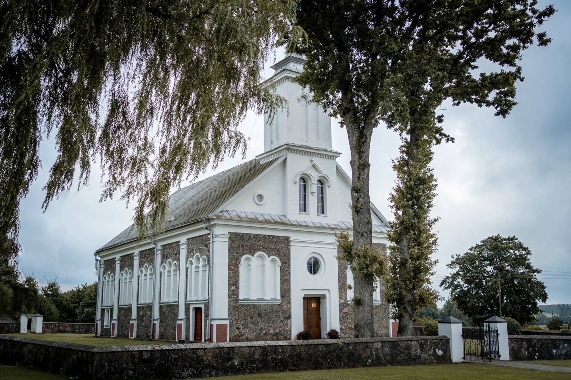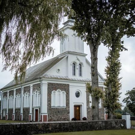 Bažnyčia istoristinė, turi romaninės ir klasicistinės architektūros bruožų, stačiakampio plano, vienabokštė. Šventoriaus tvora akmenų mūro. 1778 m. Truikinų kaime kunigaikštis Pranciškus Sapiega pastatė koplyčią. Jai 1797 m. dovanotas valakas žemės. Kaimas pavadintas Aleksandrija (nuo Aleksandro Sapiegos). 1862 m. vyskupas Motiejus Valančius leido statyti naują murinę bažnyčią. Ji statyta kunigo Liudviko Ligeikos rūpesčiu. 1918 m. ją konsekravo vyskupas Pranciškus Karevičius. Ji buvo Skuodo parapijos filija.