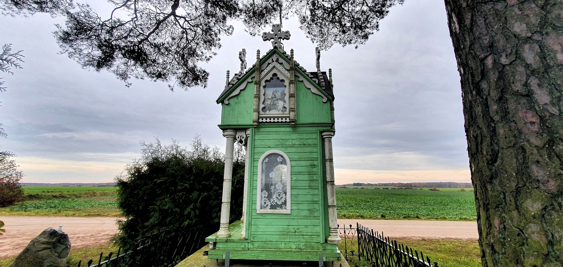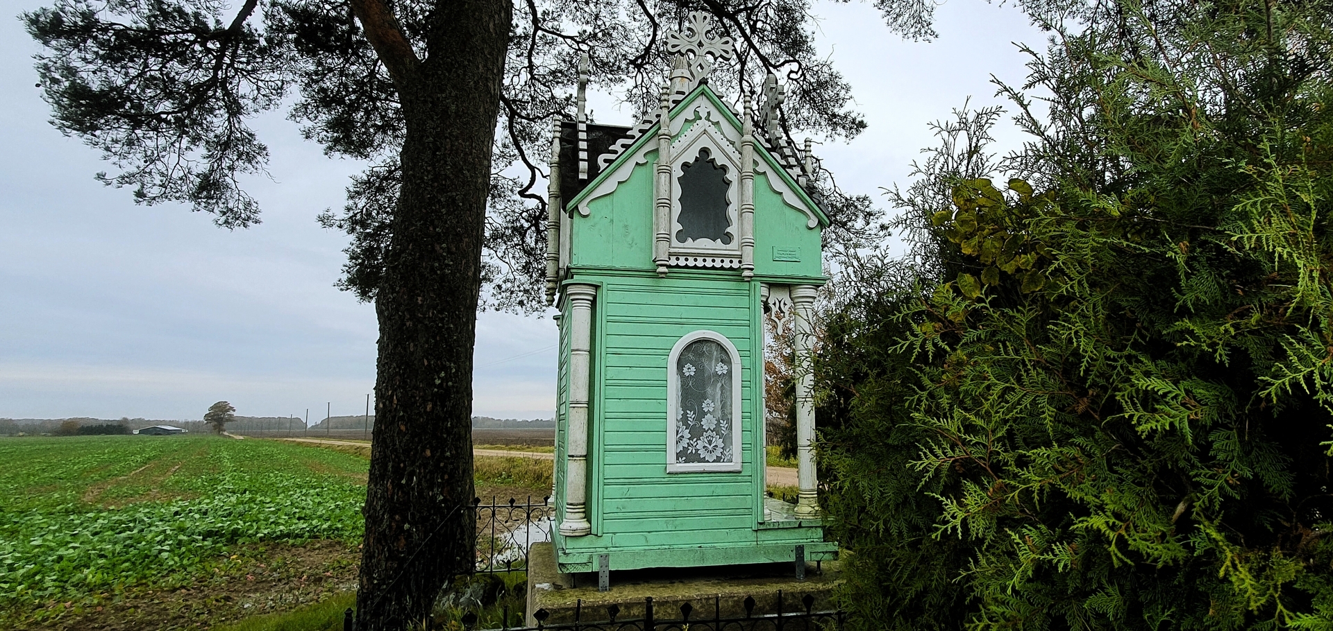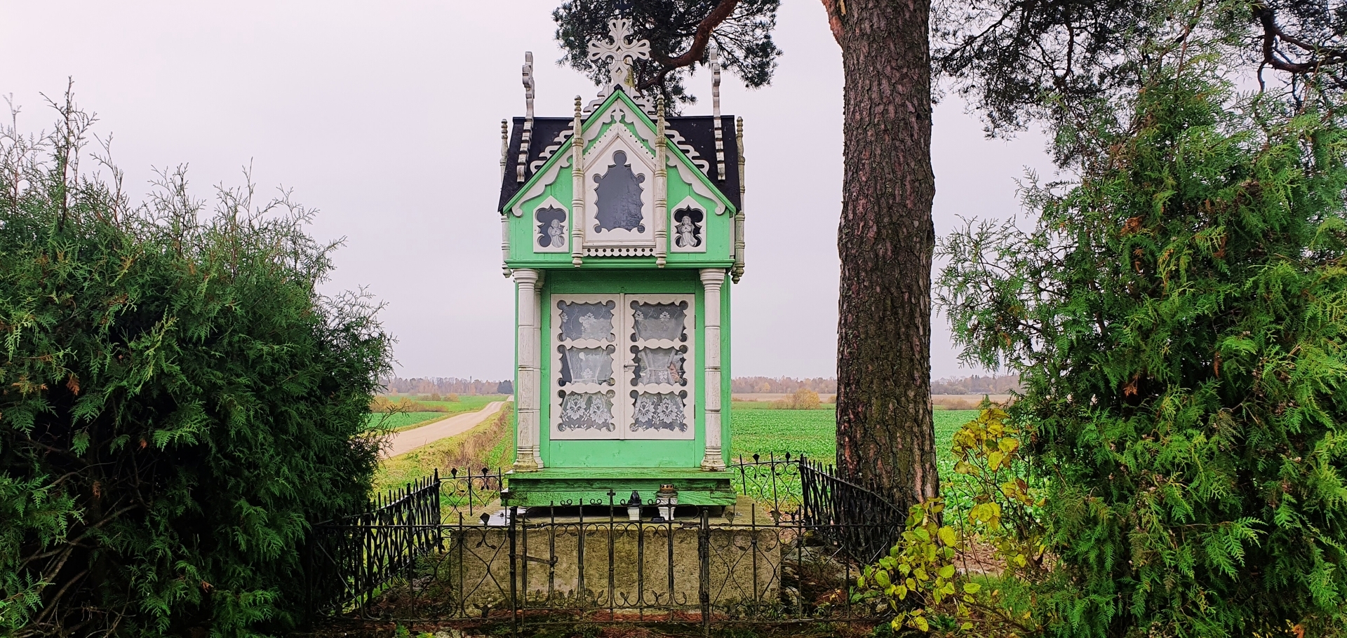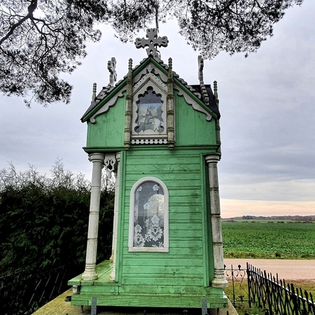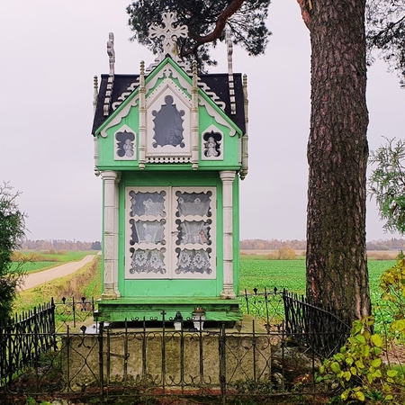 Anksčiau koplytėlės vidų puošė gausi nežinomų liaudies meistrų sukurtų autentiškų skulptūrų grupė. Vertingiausia jos dalis – XIX a. pab. – XX a. pr. sukurta Skausmingosios Dievo Motinos (Pietos) skulptūra, vaizduojanti ant kelių Jėzų Kristų laikančią Mergelę Mariją. Nors dalis šių unikalių meno kūrinių dingo be žinios, visgi prieš keletą metų atnaujinta koplytėlė išlieka stipriu vietos tapatybės ir kultūrinės atminties simboliu.