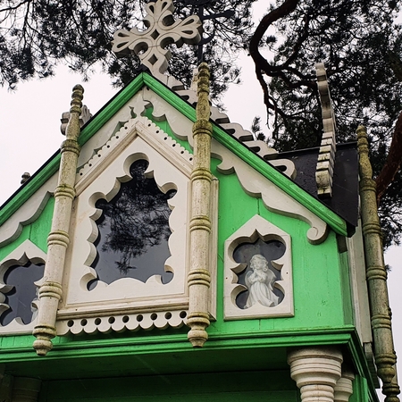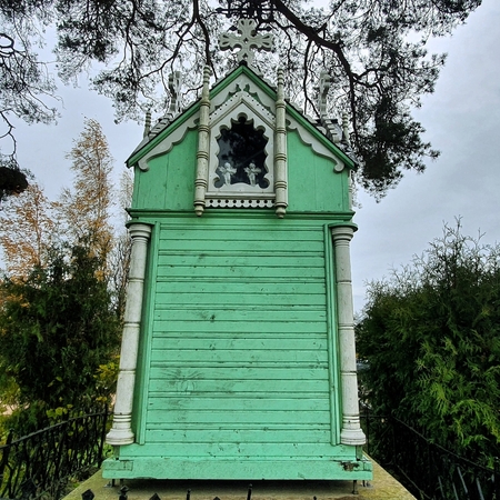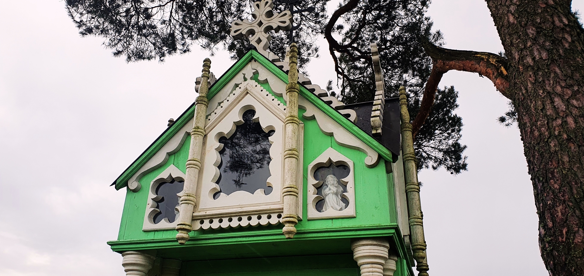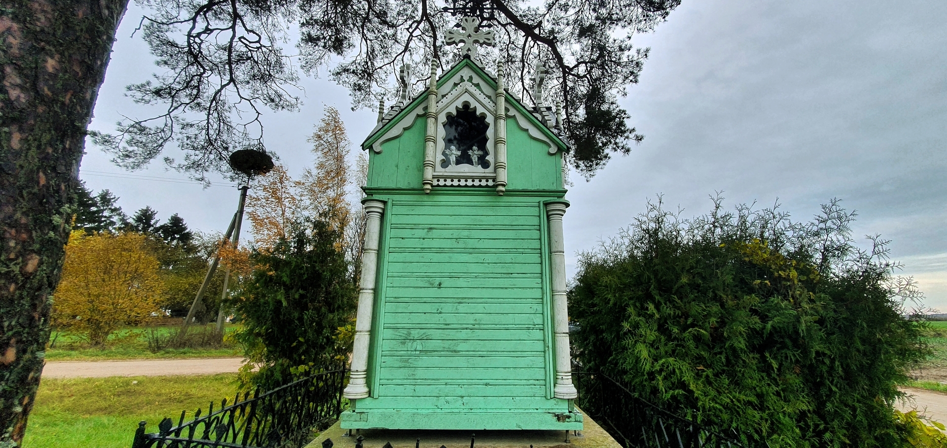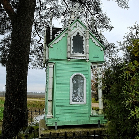 Koplytėlės eksterjere pastebimi bandymai perteikti profesionaliajai mūro architektūrai būdingus bruožus – žvelgiant į statinį išryškėja liaudies meistro kūrybinė interpretacija medyje įgyvendinti didingos šventovės viziją. Tai atsispindi dekoratyviose kolonose, tūrį skaidančiuose karnizuose bei meniškai akcentuotuose langų apvaduose. Kompoziciją papildo puošnūs frontonai, rėminami baltai dažytų pjaustinių, bei sudėtingos konfigūracijos kryžminis stogelis, virš kurio kyla stilizuoti mediniai kryželiai ir masyvesnis ažūrinis kryžius.