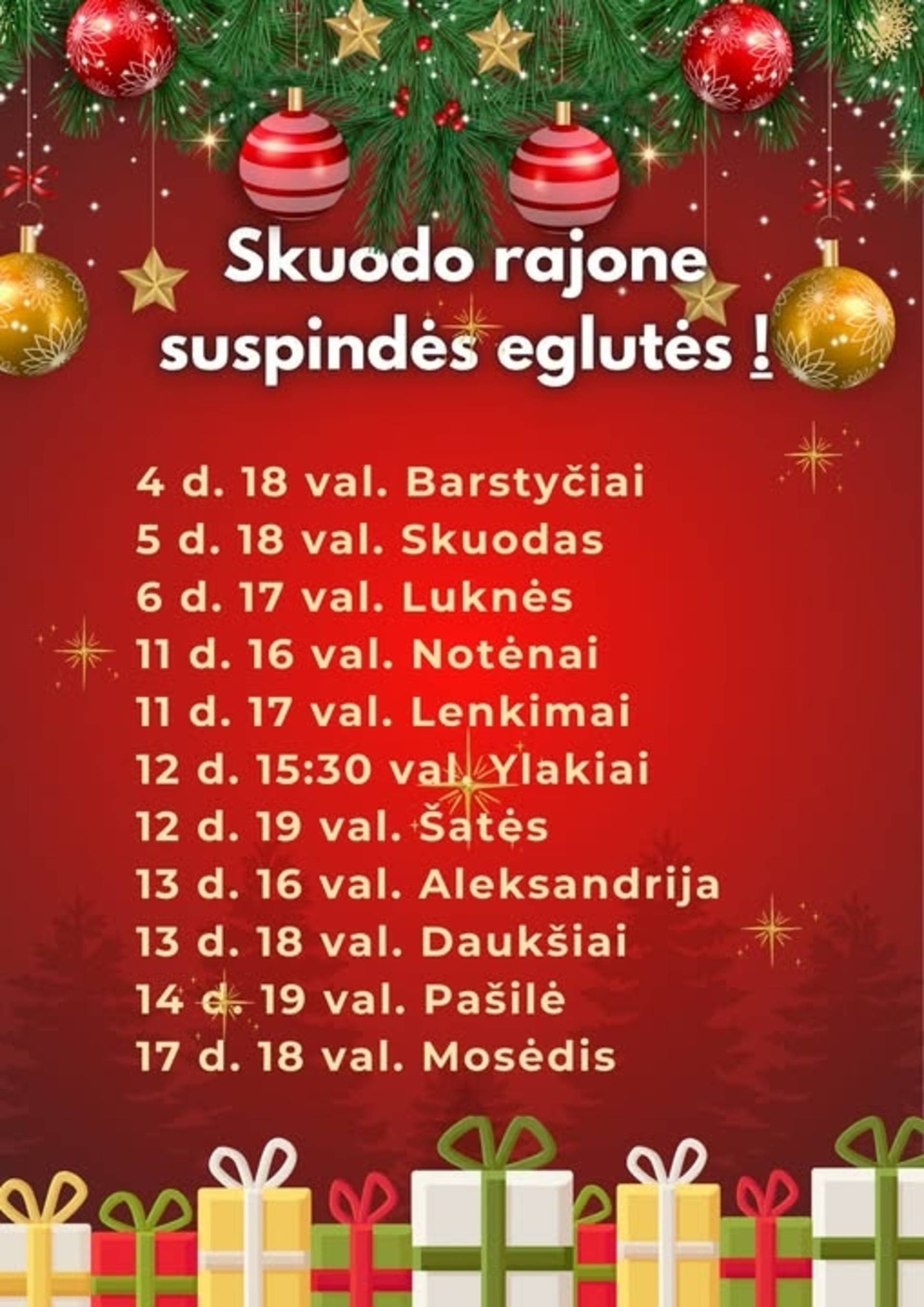 Artėjant žiemos šventėms, Skuodo rajonas pasipuošia spindinčiomis eglutėmis ir kviečia gyventojus bei svečius į tradicines eglučių įžiebimo šventes. Tai ypatingas metas, kai kiekviena miestelio ir kaimo aikštė prisipildo šviesų, muzikos, šilto bendrystės jausmo ir laukimo dvasios.